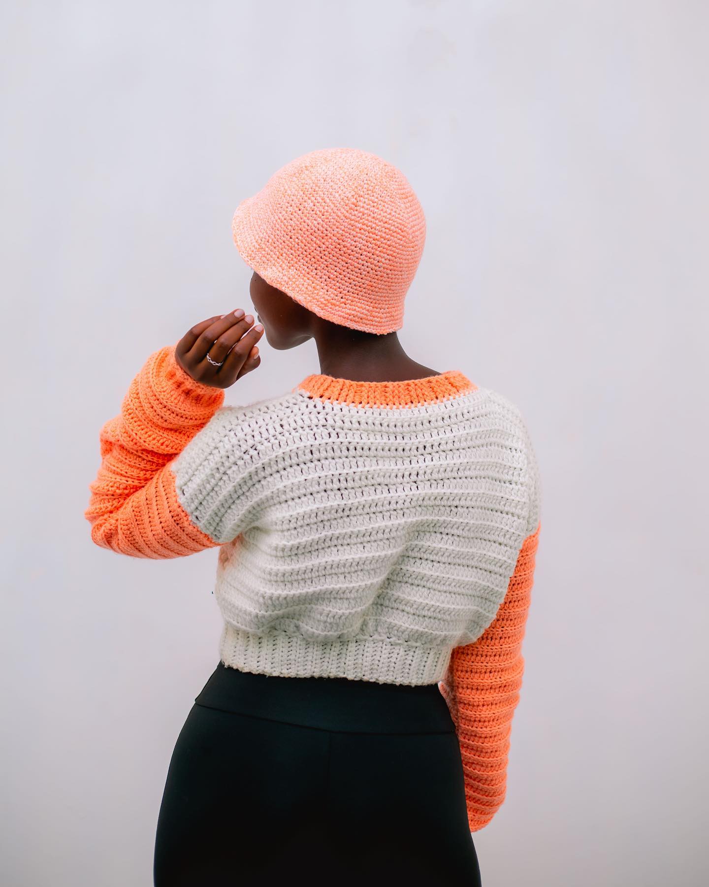 Make a bold statement with this stunning handcrafted color-block knit sweater and matching bucket hat set. Featuring a beautiful combination of soft peach and crisp white tones, this unique ensemble showcases expert crochet craftsmanship.